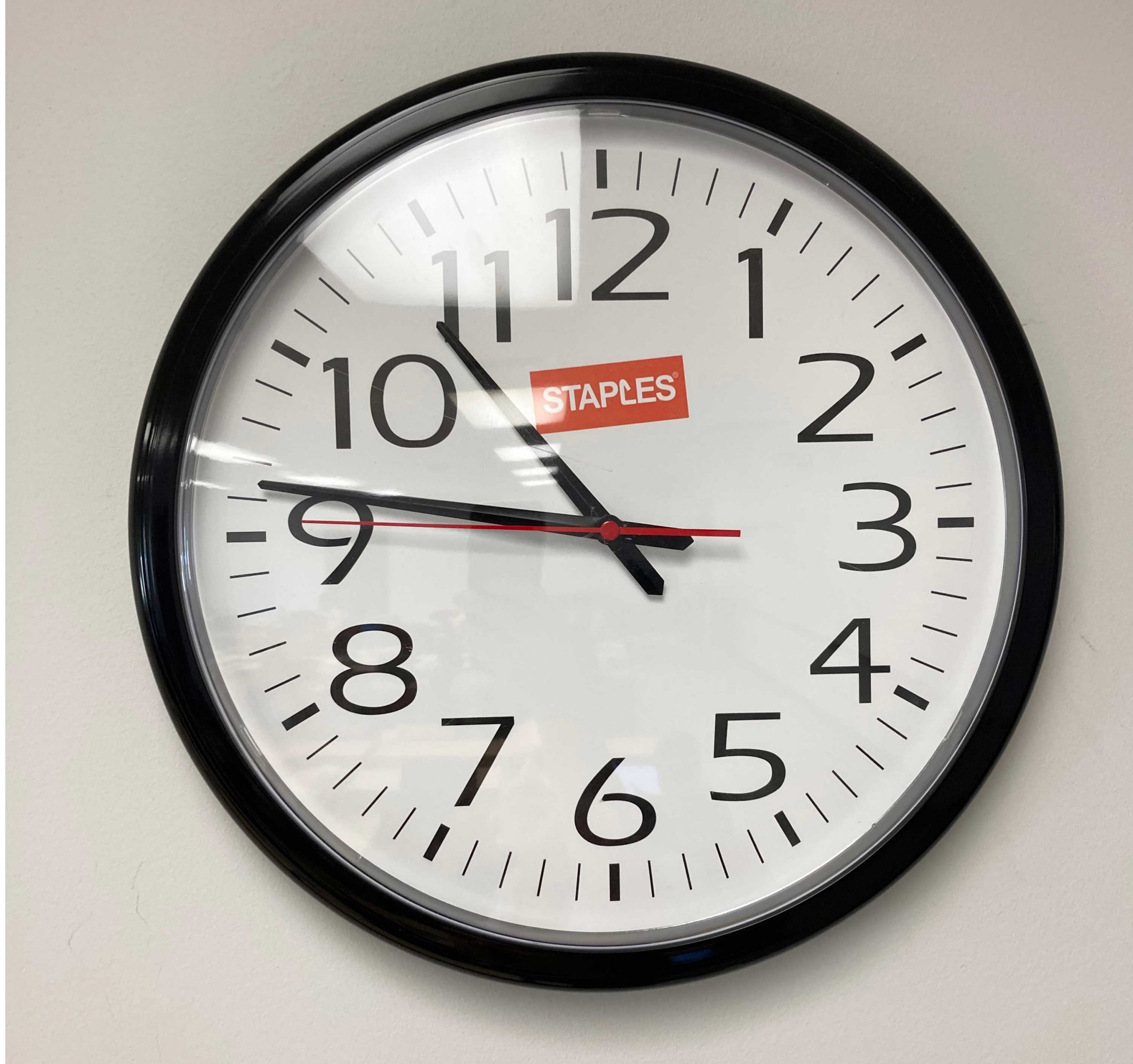 The room 235 classroom clock never changed during the Covid-19 lockdown. Photo by Kevin Swayze